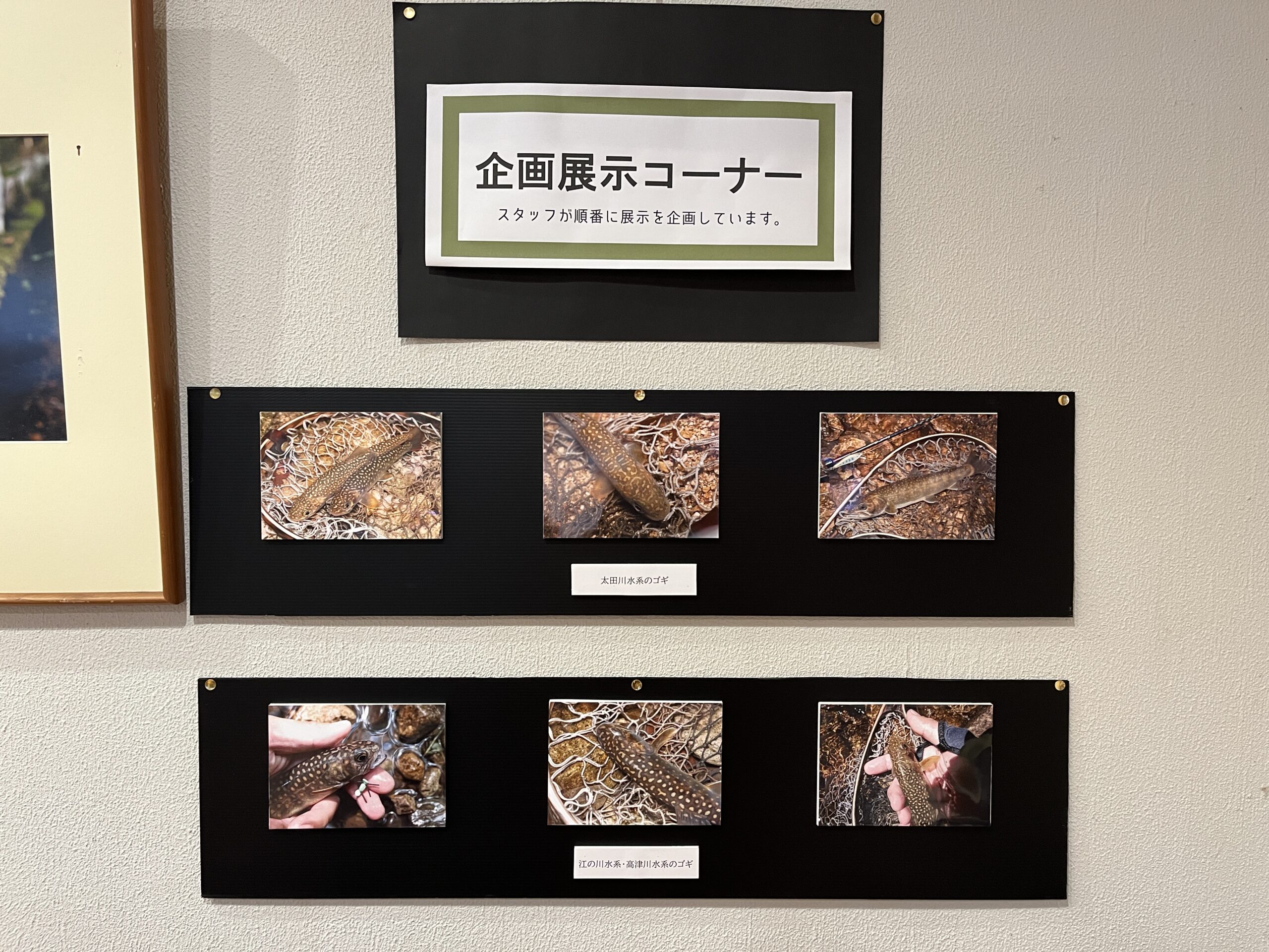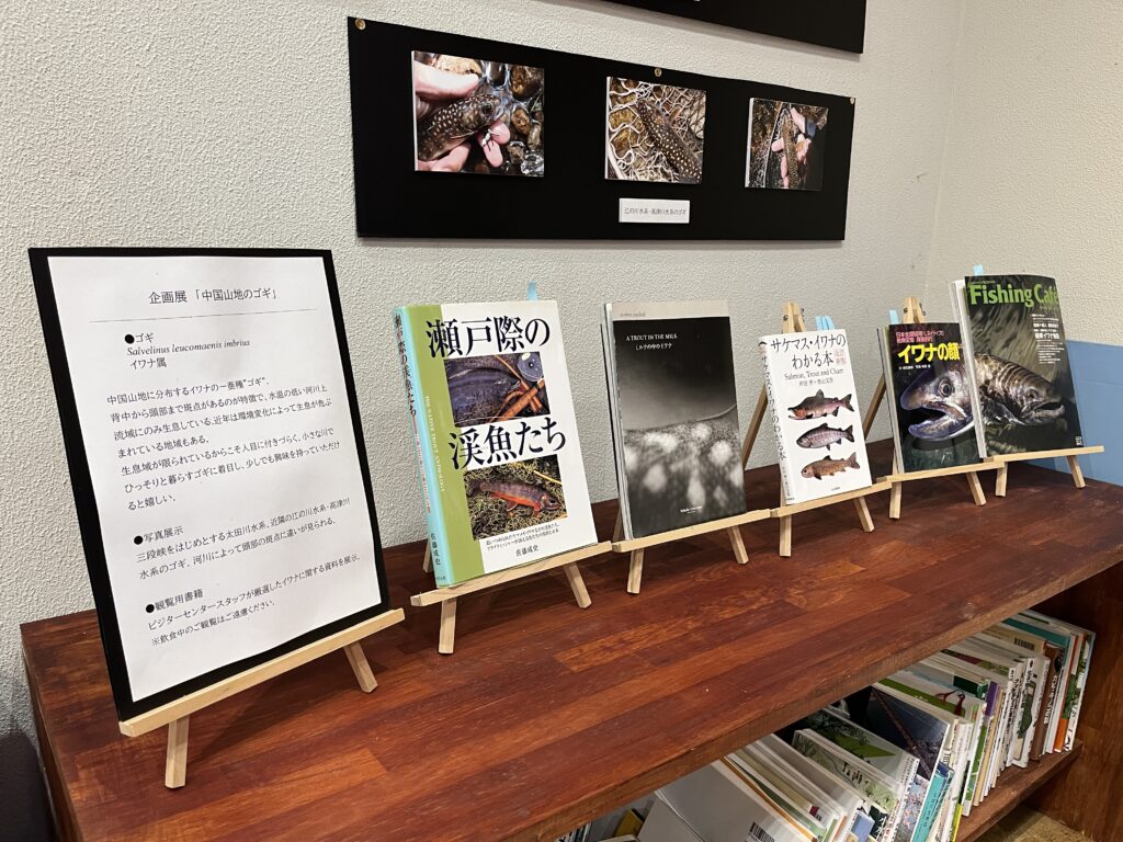 2025年9月23日 hiromi イベント, つたえる, 三段峡ビジターセンターLoupe, 環境保全・環境教育 今月の企画展では、中国山地に生息するイワナの一亜種「ゴギ」にの写真とイワナに関する書籍を展示しています。太田川水系に生息するゴギと他水系に生息するゴギの形質的違いを見たり、イワナに関する知識を深めるきっかけになると嬉しいです。次回は三段峡の歴史に関する企画展を実施予定です。 0