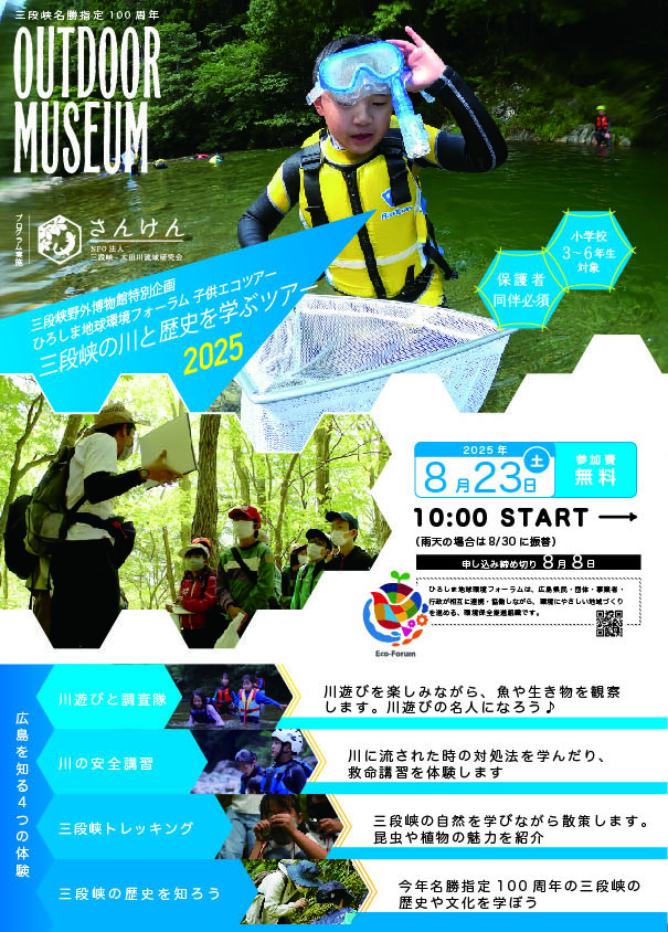 2025年8月4日 design イベント, しらべる, つたえる, 文化・歴史継承, 環境保全・環境教育 8/23(土) 10:00〜『三段峡の川と歴史を学ぶツアー』を開催します。 対象:小学三年生〜六年生参加費:無料プログラム内容・川遊びと調査隊・川の安全講習・三段峡トレッキング・三段峡の歴史を知ろう1日盛りだくさんのプログラムです。夏休み、広島の自然を親子で学びながら一緒に楽しみましょう。去年の様子はコチラから申し込み締切は8/8までです。ご参加お待ちしております。申し込みフォーム 0